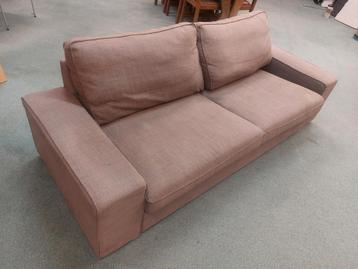 Een tweezitter bank in een bruine kleur. De bank heeft twee zitkussens en twee rugkussens. De stof is geweven en heeft een lichte textuur. De armleuningen zijn breed en recht.