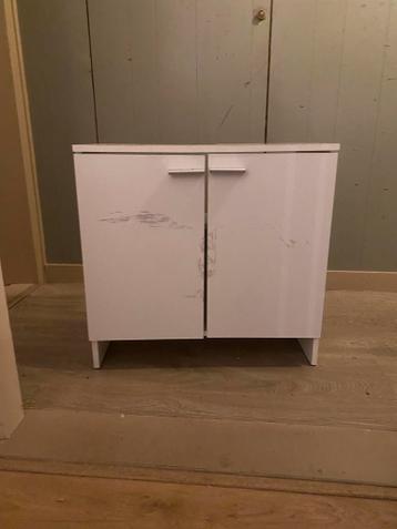 Witte wastafelkast met twee deurtjes, ideaal voor onder een wasbak. Biedt handige opbergruimte in de badkamer. Let op: de kast heeft duidelijke gebruikssporen, zoals te zien op de foto's. Perfect