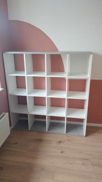 Dit is een wit vakkenkastje met 16 vakken. De bovenkant is grijs. Het kastje kan gratis opgehaald worden en moet zelf uit elkaar gehaald worden.