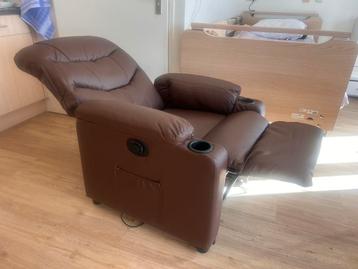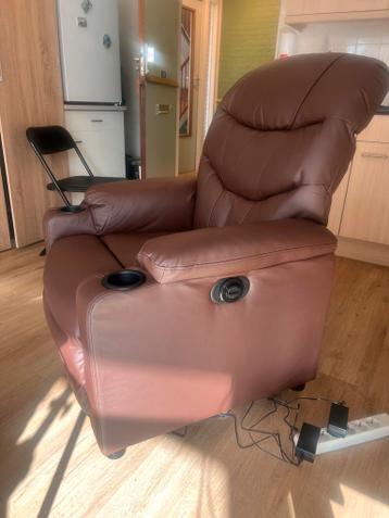 Deze bruine relaxfauteuil is in uitstekende staat en biedt optimaal comfort. De stoel is voorzien van handige bekerhouders en een elektrisch verstelbare functie, waardoor u eenvoudig de perfecte zit-
