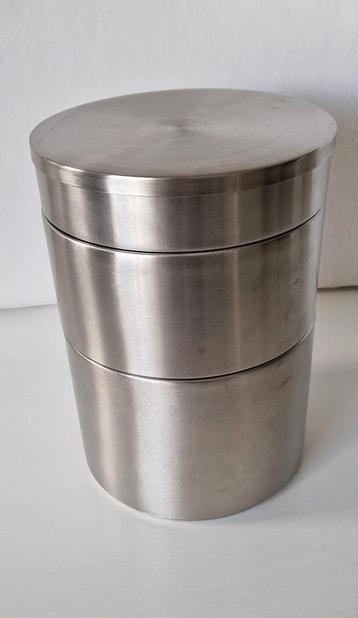 Roestvrijstalen opbergpot, heeft drie aparte lagen en een deksel.