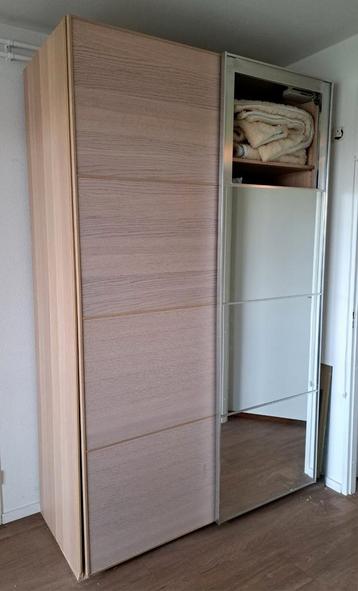 Ikea pax kast voor onderdelen. De kast heeft twee schuifdeuren waarvan 1 met spiegels. Binnenin zitten schappen, twee keer drie binnenlades en een rek om broeken over te hangen. De kast is gebruikt ma