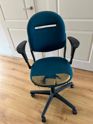 Professionele bureaustoel, donker blauw. In goede staat, alleen de bekleding van de zitting is kapot.