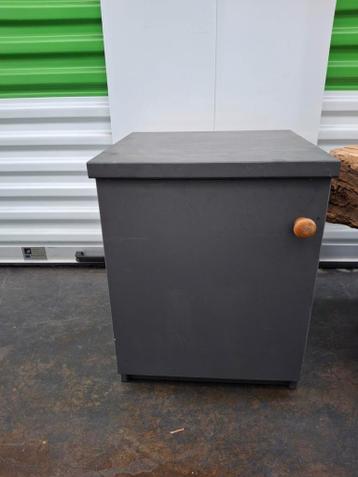 Een grenenhouten kastje, grijs geverfd aan de buitenkant. Binnenin heeft het kastje twee vakken. De deur heeft een houten knop.