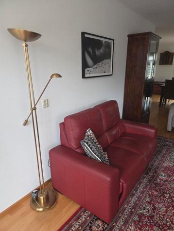 Comfortabele rode bank met een handig uitschuifbaar gedeelte, waardoor de bank eenvoudig van een zitbank naar een ligbank kan worden omgevormd. De bank is bekleed met rood leer en biedt plaats aan twe
