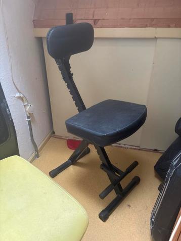 Een zwarte kruk met een rugleuning. De zitting en rugleuning zijn bekleed. Het onderstel is van metaal en heeft een voetsteun. De hoogte van rugleuning zitting en voetsteun is verstelbaar.