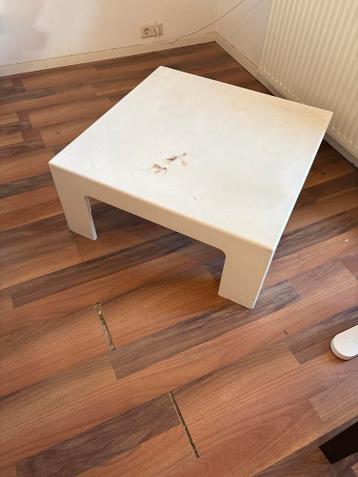 Deze witte vierkante salontafel is gebruikt en heeft enkele vlekken op het oppervlak, zoals te zien op de foto's. Ideaal als project om op te knappen of voor wie een functionele, eenvoudige tafel