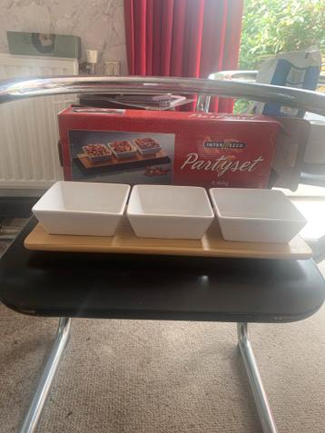 Dit is een 4-delige partyset van intermezzo. De set bestaat uit drie witte schaaltjes en een houten plankje. De schaaltjes zijn vierkant en staan op het plankje. Op de doos staan pinda's en nootje