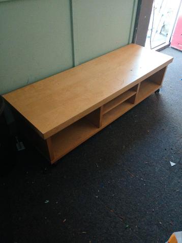 Dit is een houten tv-meubel met open vakken. Het meubel heeft gebruikssporen en is gratis af te halen. Het stond hier in de garage en er stonden 3d printers op.