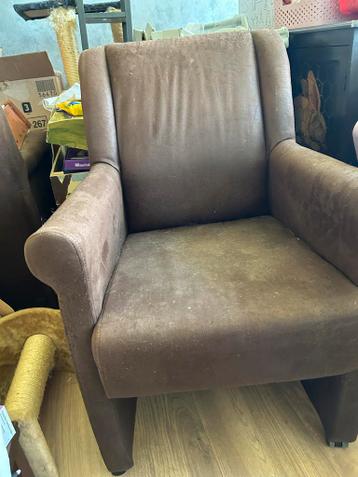 Twee comfortabele bruine stoelen. Ze zijn gebruikt en hebben lichte krabsporen van katten, voornamelijk op de armleuningen en de rugleuning. Met een mooie stoelhoes eroverheen zijn het nog prima stoel