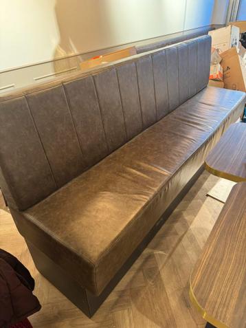 Lange bank van bruin leer, ideaal voor horeca of thuis