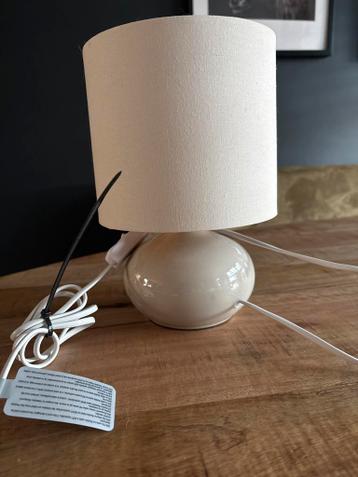 Dit is een klein schemerlampje met een stoffen kap. De voet is van keramiek. De lamp is 25 cm hoog en heeft een wit snoer met een schakelaar. De binnenkant van de kap is koperkleurig.