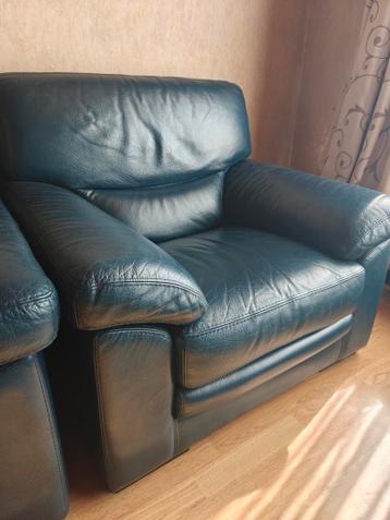Twee lederen zetels, zitten perfect. Er zijn twee hoezen om de zitkussens van de grote zetel te vernieuwen. De zetels zijn gebruikt en hebben zichtbare slijtage op het leer. Gratis op te halen in nin