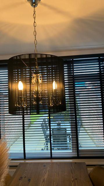 Deze zilverkleurige kroonluchter heeft een zwarte, doorzichtige kap. Er missen een paar kralen aan de kroonluchter. De lamp heeft drie lichtpunten.