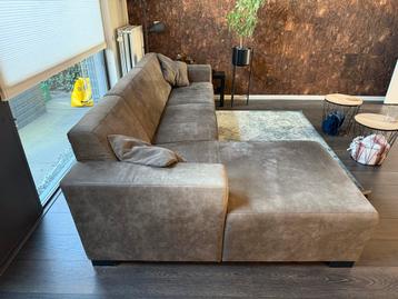 Een grijze hoekbank van 275cm x 150cm. De zitdiepte is 80cm. De bank heeft een imiteerleer bekleding en is gebruikt.