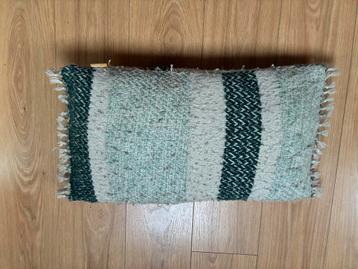 Dit is een sierkussen van malagoon. Het kussen heeft een groen en wit gestreept patroon en franjes aan de zijkanten. Het is een rechthoekig kussen 60x33cm. Gebruikt dus gratis af te halen.