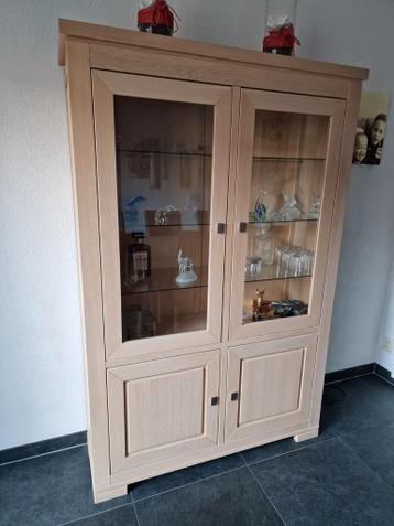 Mooie licht eikenhouten vitrinekast met glazen deuren en ingebouwde verlichting. Ideaal voor het tentoonstellen van uw mooiste spullen. De kast is in uitstekende staat en biedt zowel open als gesloten