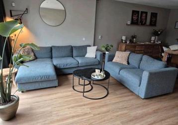 Mooi bankstel bestaande uit een ruime hoekbank en een bijpassende 3-zitsbank. De banken zijn bekleed met een lichtblauwe stof en verkeren in goede, gebruikte staat. Ideaal voor een starter of als extr