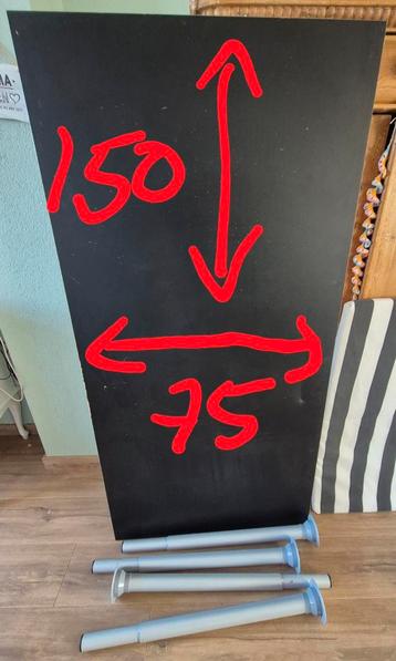Stevig zwart bureau van 150 cm lang en 75 cm breed, met op hoogte verstelbare poten. Het blad is gebruikt maar in goede staat.