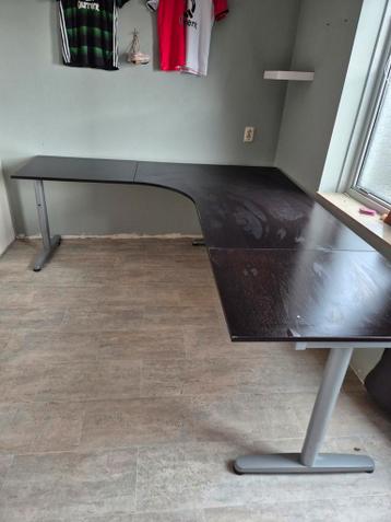 Dit is een hoekbureau met een donkerbruin blad en zilverkleurige poten. Het bureau bestaat uit drie delen die aan elkaar zijn bevestigd. Er zijn wat gebruikssporen zichtbaar op het blad. Breedte 200cm