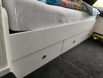 Dit is een wit 1 persoons bed met 3 laden en verstelbaar lattenbodem. Gratis op te halen ( zonder matras en dergelijke )