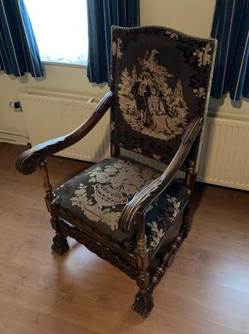 Gobelin stoel antiek: 100 jaar+ antieke stoel (100 jaar +) voorzien van gobelin bekleding met figuratieve motieven mooi houtsnijwerk en in redelijk goede staat hoogte 117 cm, zitbreedte voor 52 cm, z