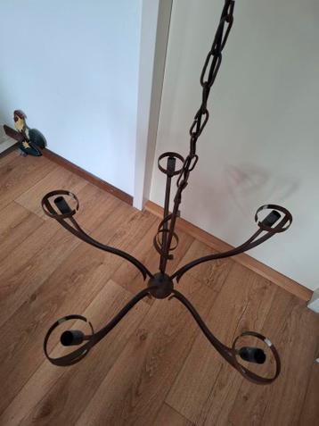 Bruinmetalen kroonluchter, kelken zijn helaas gesneuveld. Maar met wat creativiteit wellicht nog te gebruiken.