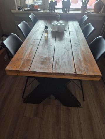 Mooie, gebruikte eettafel met een robuust houten blad en een stevig houten onderstel. De tafel is gebruikt en heeft wat liefde nodig: een lichte schuurbeurt en een likje verf op de poten en hij is wee