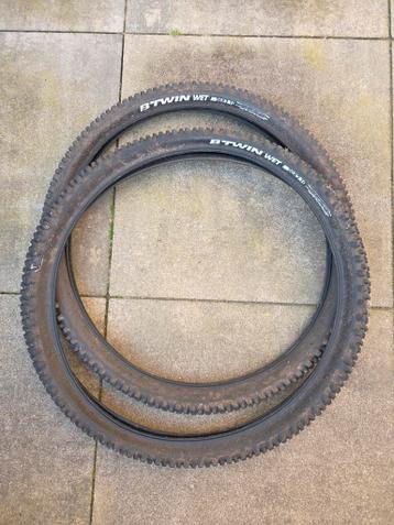 Set van twee ongebruikte b'twin wet mountainbike banden, maat 26x2.10. Ideaal voor modderige en natte omstandigheden dankzij het grove profiel. Perfect als reserve of voor een upgrade van je huidi