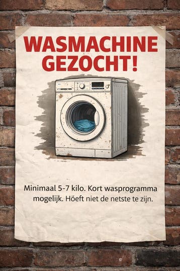 We zoeken een gratis wasmachine voor onze eigen wasserij. Minimaal 7 kilo inhoud en een kort wasprogramma is handig. Het hoeft niet de nieuwste of netste te zijn, als hij maar werkt. Wij hebben allen