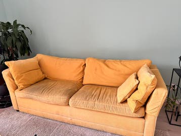 Bank 87cm x 215 cm, mosterdgeel. Gratis af te halen in delft. De staat is goed. De kussens kunnen een wasbeurt gebruiken.