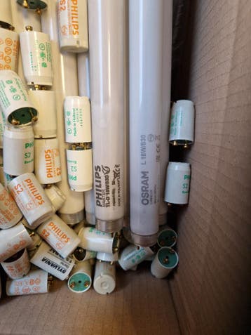 75 stuks gebruikte tl-lampen (dus géén led) met starters. Merk is osram (lumilux l18w/830) en philips (master tl-d 18w/830). Helder wit. Lengte 39 cm. Alles bijeen in één grote doos. Af te halen in es