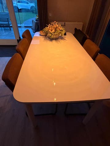 Uitschuiftafel wit (licht beschadigd/zie foto) metalen onderstel. Lengte 149/204/240 cm. Breedte 93 cm