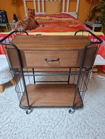 Mooie vintage serveerwagen met een handige lade. Ideaal voor in de woonkamer, keuken of als bijzettafel. De wagen is gemaakt van hout en metaal en staat op wieltjes, waardoor hij gemakkelijk te verpla