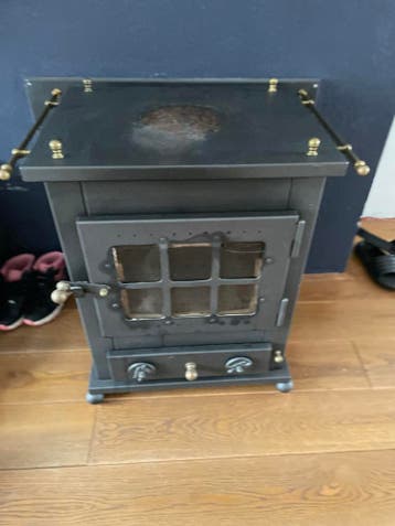 Dit is een kleine zwarte kachel. De kachel heeft een glazen deurtje en een lade aan de onderkant. Bovenop zit een ronde plaat. De kachel is gebruikt en heeft wat gebruikssporen, zoals te zien op de fo