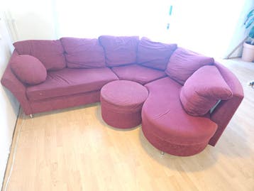 Stijlvolle rode hoekbank met bijpassende poef. De bank heeft mooie ronde vormen en zachte ronde hoeken, wat hem een vriendelijke en moderne uitstraling geeft. De hoezen van alle kussens en zittingen z