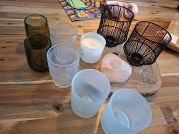 Een verzameling van verschillende kaarsenhouders en theelichthouders en een kaars en houten boomschorsonderzetter.