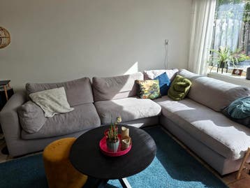 Grote hoekbank (excl salontafel/poef/sierkussens/accessoires). Taupe/grijze kleur. Op sommige foto's lijken de kussens roze verkleurd. Dit is niet zo. Lange gedeelte: 305cm. Gedeelte met lounge 21
