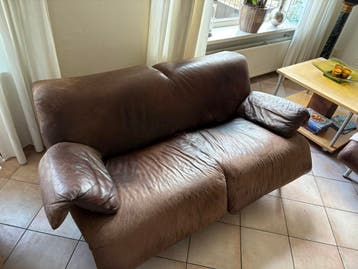 Gratis af te halen : 2 bruine tweezitsbanken van leer. De banken hebben twee zitkussens en twee armleuningen. De banken zijn gebruikt . De drapeaus kunt u er gratis bij krijgen indien gewenst. Gratis