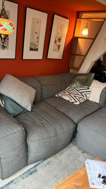 Grijze modulaire bank met drie zitplaatsen en een losse poef. De bank is gebruikt en wegens een nieuwe bank doen wij deze weg. We hebben hem deels uit elkaar gehaald, dus gemakkelijker te vervoeren! D