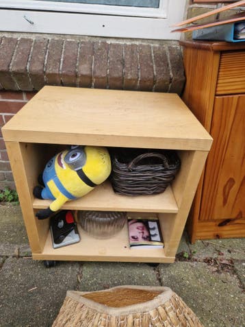Dit is een houten kastje met twee vakken. Het kastje staat op wielen. Er zit een plank in het midden.