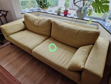 Mosterdgele 3-zits bank, afmetingen 240x88x65 cm. De bank is gebruikt en heeft een klein brandgat op een van de zittingen, dit is omcirkeld op de foto. Alsnog heel fijn voor tijdelijk, studentenhuis o