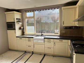 Gratis afhalen in overleg. Keuken kampioen keuken van 22 jaar oud. Crème kleur. Granieten aanrechtblad. Keramische wasbak. Kraan old fasion. Koelkast werkt zoals hij moet werken. Vaatwasser doet wat h