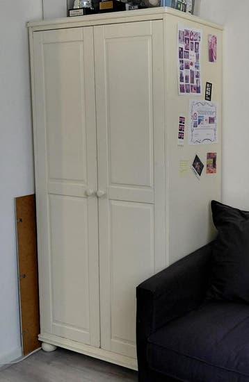 Roomwitte kledingkast in gebruikte staat (heeft een likje verf nodig). Afmetingen: 165 cm hoog x 78,5 cm breed x 50 cm diep. Ideaal voor extra opbergruimte in de slaapkamer of hal. De kast heeft twee