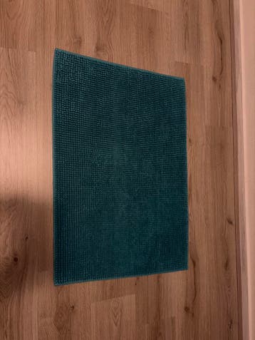 Een badmat in een blauwe kleur. De mat heeft een rechthoekige vorm en een textuur met kleine lusjes.