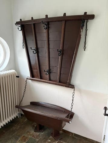 Deze kapstok is gemaakt van donker hout en heeft zes zwarte haken. Er zit ook een bankje aan vast met kettingen. De kapstok is gratis af te halen.