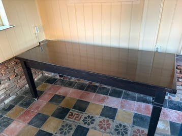 Nette tafel op wieltjes. De afmetingen zijn 180cm lang en 70cm breed. De tafel heeft een donkerbruin blad en donkere poten. De wieltjes zitten onder de poten.