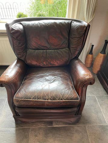 Gratis af te halen: comfortabele leren stoel. De stoel is gebruikt en heeft duidelijke gebruikssporen, zoals te zien op de foto's. Ideaal voor wie op zoek is naar een extra zitplek en niet bang is