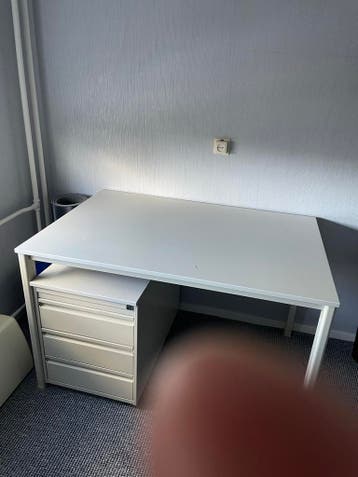 Stevig wit bureau met een handig ladeblok, perfect voor een thuiskantoor of studeerplek. Het bureau is gebruikt, maar verkeert nog in goede staat en biedt voldoende werkruimte. Het ladeblok zorgt voor