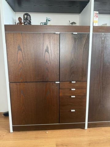 3 wenge kleurige pastoekasten. Staan nu los van elkaar maar kunnen ook naast elkaar gezet worden. Losse planken, in dezelfde kleur, erbij. Mooie en functionele pastoe kasten (3 stuks). Ideaal voor de